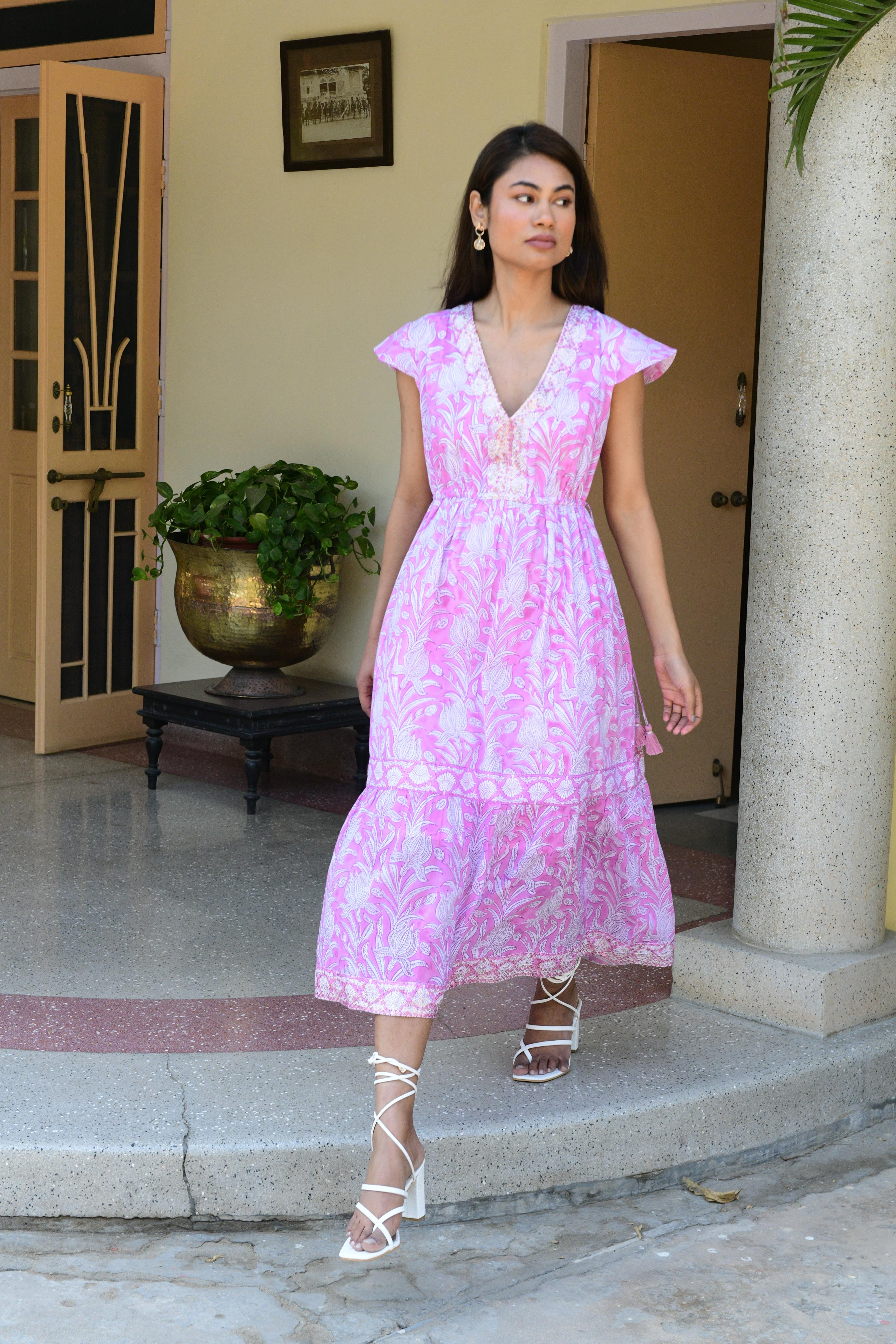 A flattering V neckline is finished with delicate embroidery, while soft cap sleeves and a midi length that falls below the knee create an easy, timeless silhouette.