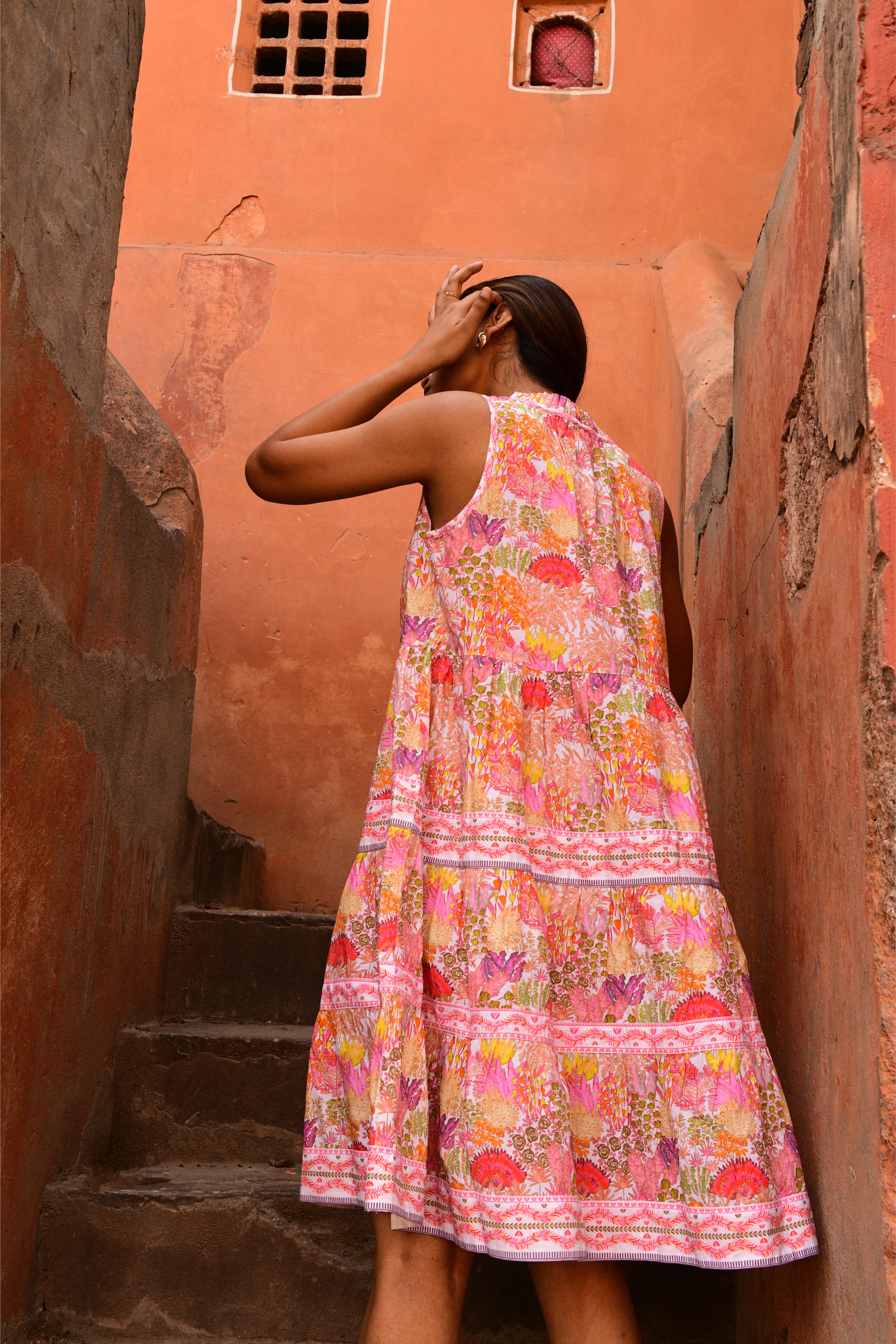 A playful ode to sun-drenched days, the Lush Mini Dress captures the effortless charm of 1950s resort dressing—reimagined in our vibrant tropical Lush print. Crafted in crisp, breathable cotton poplin, this sleeveless silhouette feels light, fresh and endlessly flattering.