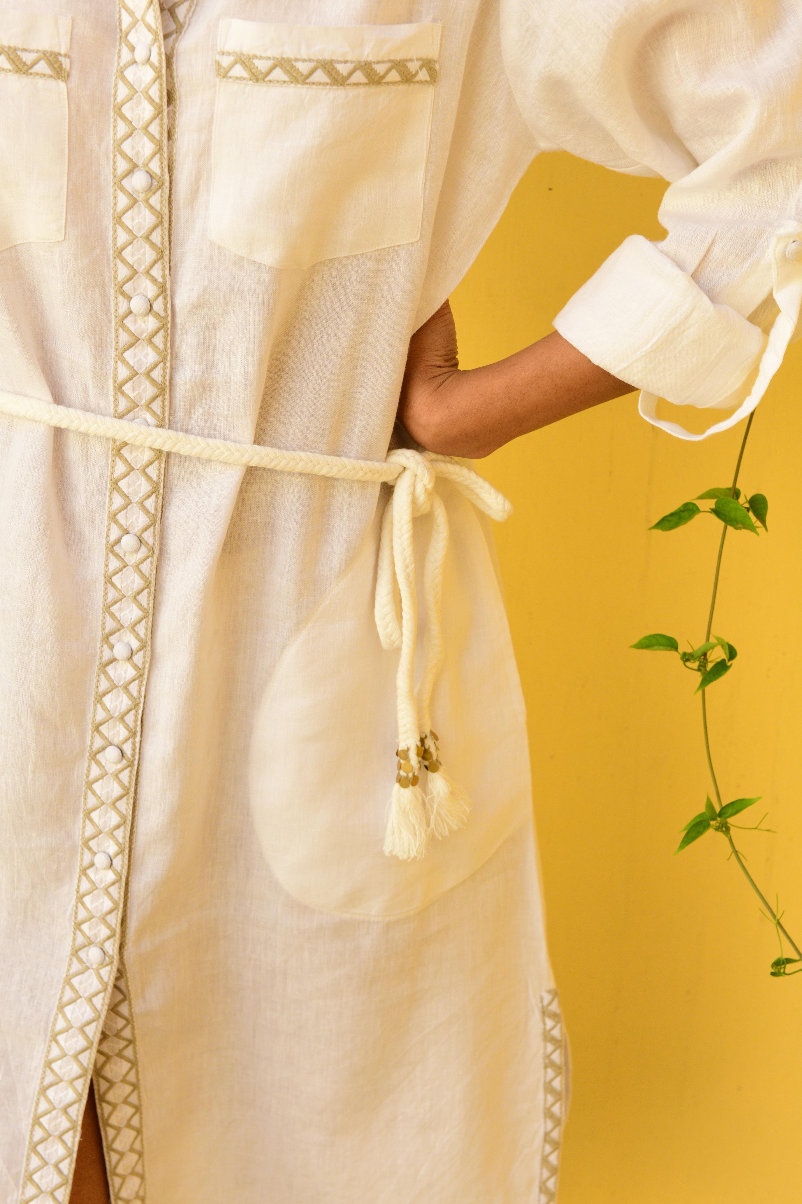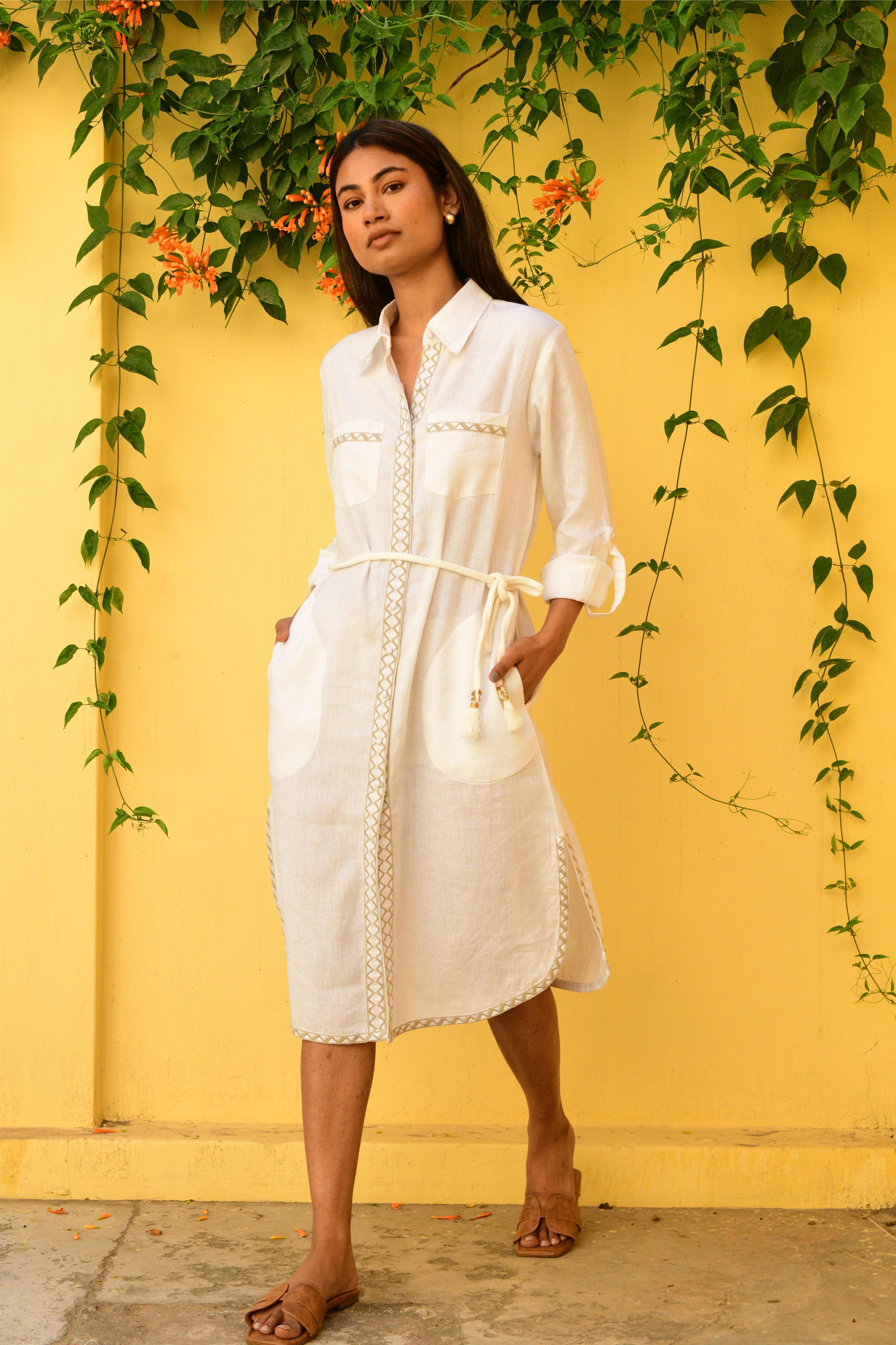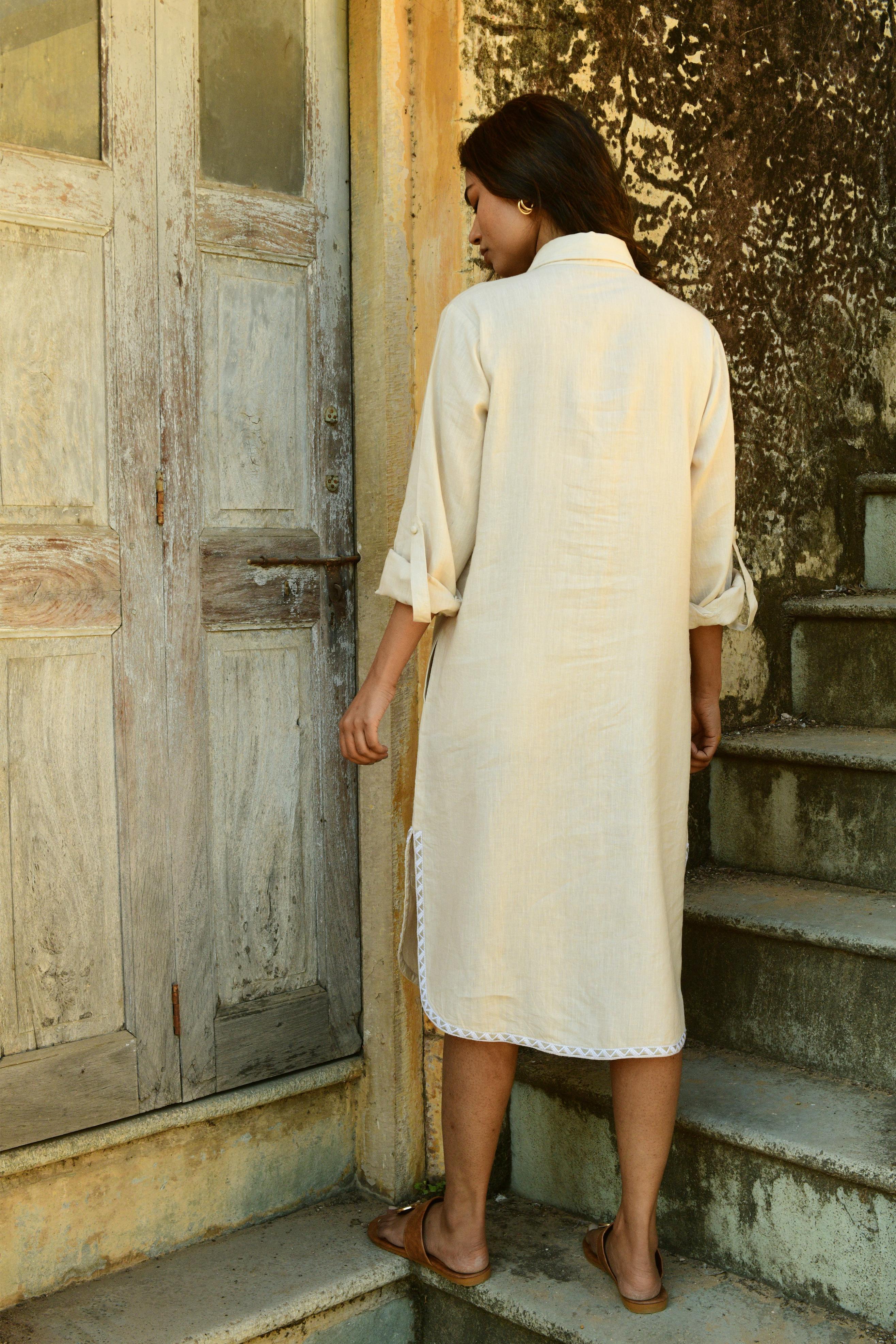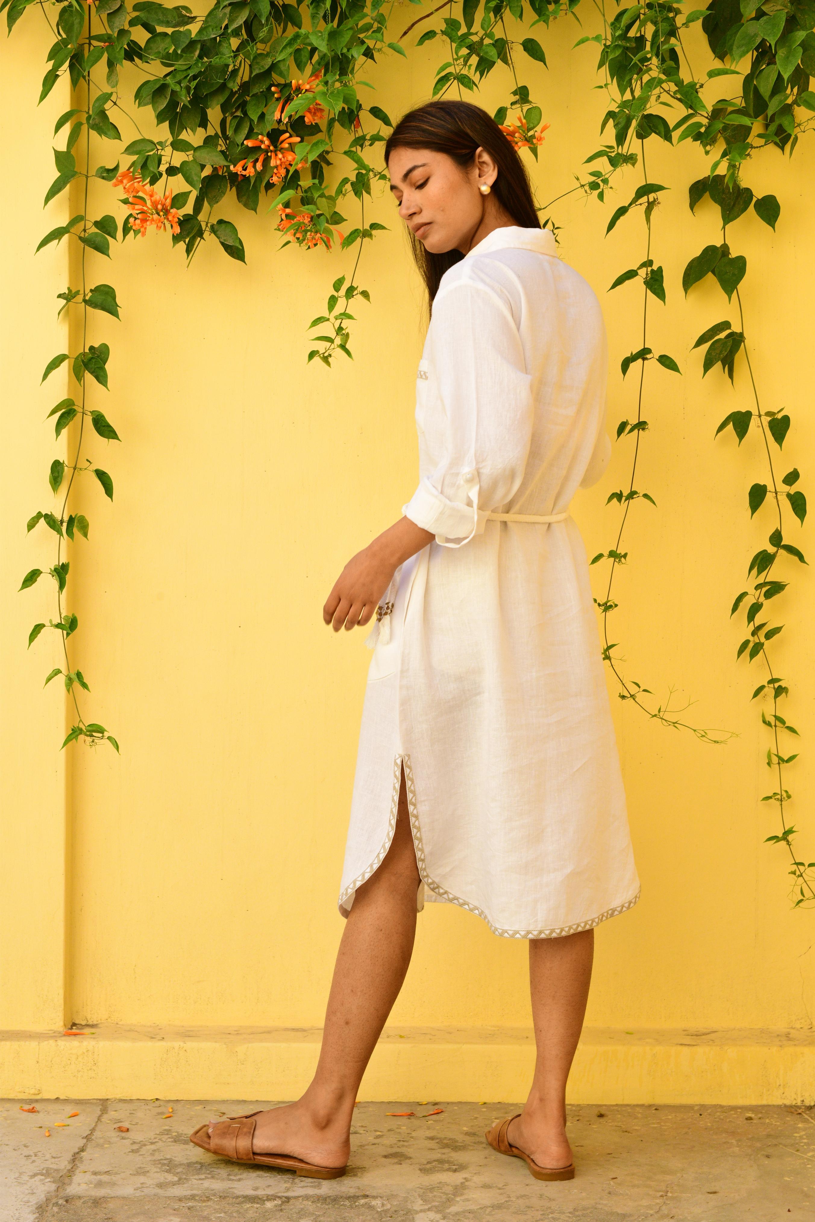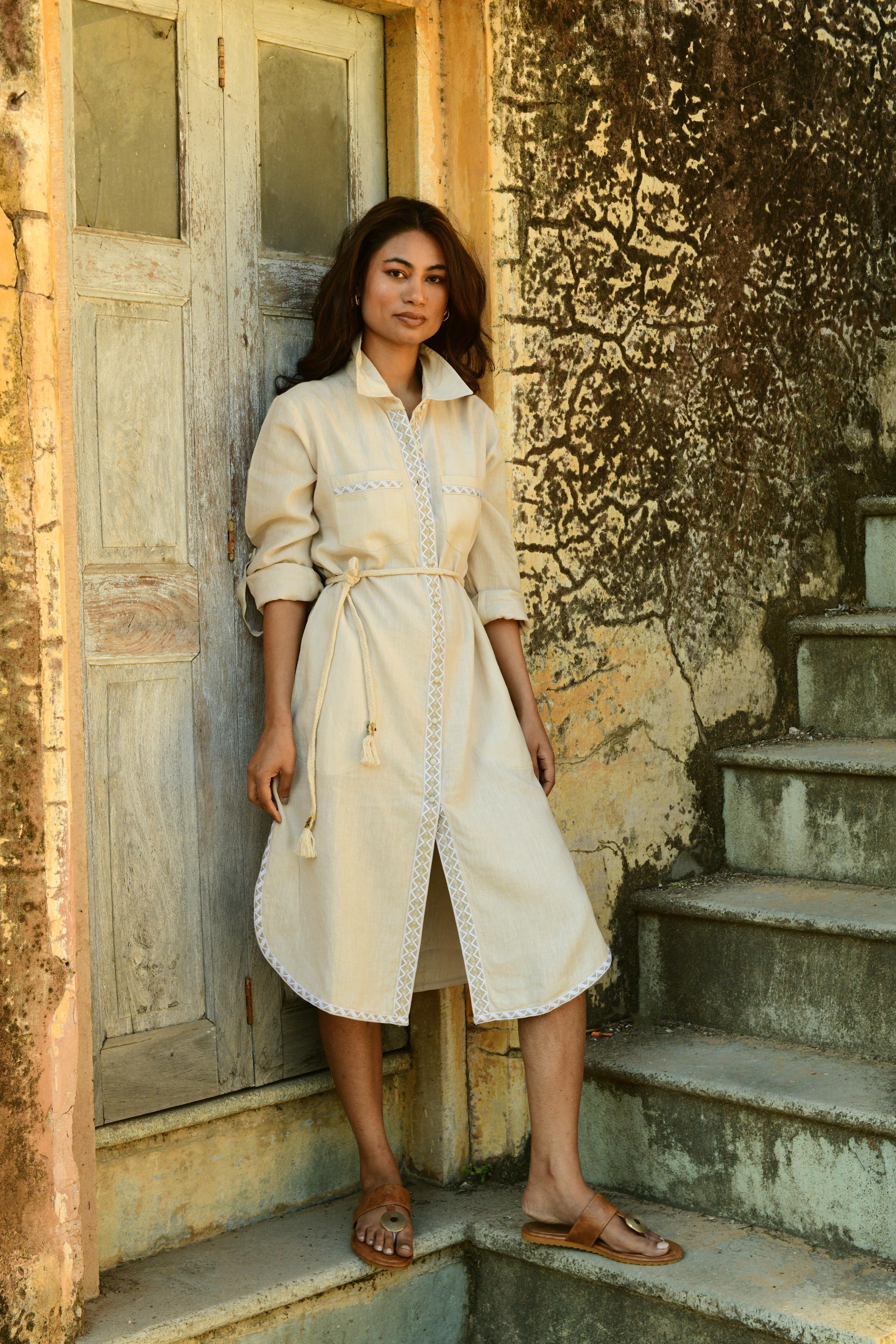 The Maya Shirt Dress reimagines a wardrobe classic in natural linen with elevated detailing. Featuring a button-through front and a flattering midi length, this versatile silhouette is finished with tabs on the sleeves, a crisp collar, and delicate embroidery trims for a subtle artisanal touch.