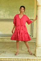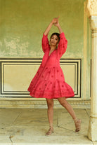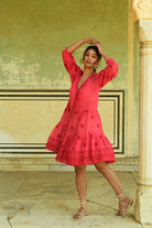 Voluminous balloon sleeves with cutwork lace accents bring feminine drama, while the hem is adorned with intricate cutwork lace, creating a striking, artisanal finish. Falling to a flattering knee length, this dress is light, breathable, and perfect for festive summer events, garden parties, and warm days where ease meets elevated style.