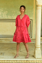 The Joy Shirt Dress is a romantic summer statement, crafted in a rich deep cherry red and finished with beautifully detailed cutwork lace. Designed with a half button placket that finishes at the waist, it features refined pintucking across the front bodice for soft structure and subtle texture.