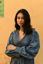 The Aster Shirt Dress is a romantic statement, crafted in a rich deep denim and finished with beautifully detailed cutwork lace. Designed with a half button placket that finishes at the waist, it features refined pintucking across the front bodice for soft structure and subtle texture.