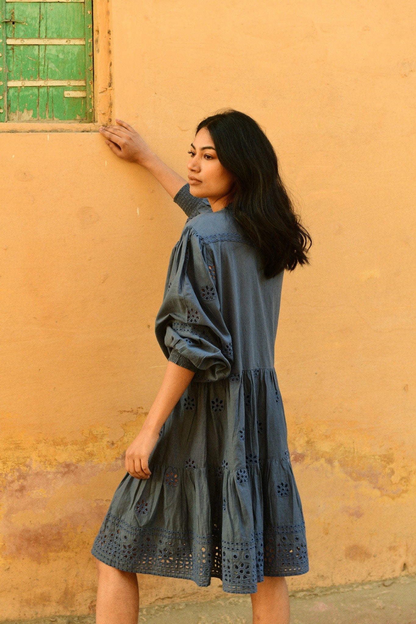 Voluminous balloon sleeves with cutwork lace accents bring feminine drama, while the hem is adorned with intricate cutwork lace, creating a striking, artisanal finish. Falling to a flattering knee length, this dress is light, breathable, and perfect for Tran seasonal dressing. Team with boots or slides depending on the season!