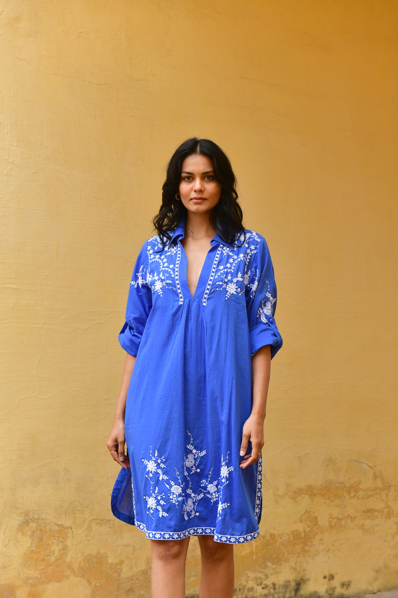 Relaxed, effortless and endlessly wearable, the Côte d’Azure Shirt Dress is crafted in soft cotton and finished in signature electric blue with bespoke white embroidery. Designed with a flattering V neckline and cuffable sleeves, it falls to a rounded knee-length hem with a slightly longer back and subtle side splits for easy movement.