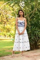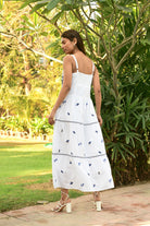 The Paradise Midi Dress is crafted from soft white cotton and adorned with tonal blue and nude embroidery from top to hem. The bra-friendly straps offer easy everyday wear, while the shirred back provides comfort, flexibility and the perfect fit. Falling to a flattering midi length, this style blends feminine detailing with relaxed Australian resort wear sensibility.