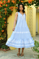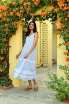 The Symi Maxi Dress is crafted in softly textured blue seersucker for an easy, breathable feel. Designed with a clean sleeveless silhouette, it falls effortlessly through the body to a flowing maxi length. Bespoke applique embroidery adorns the neckline and full flowing hem.