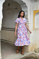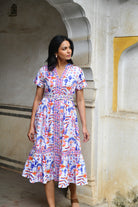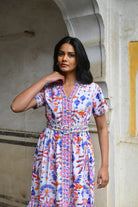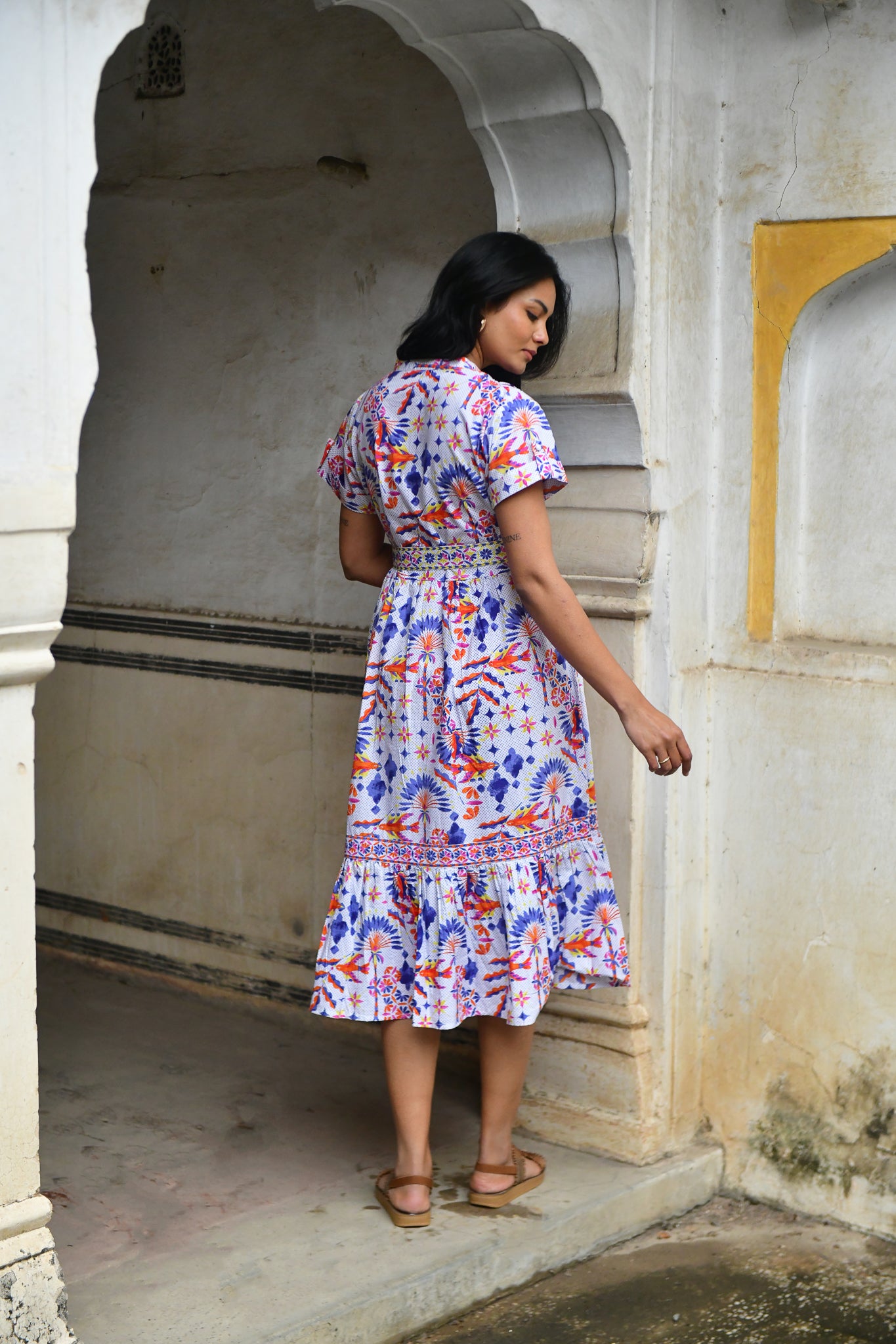 The Bird of Paradise Sundress is crafted in crisp poplin cotton, offering a beautifully light and breathable feel for warm days. The button-through front creates a clean, flattering line, while the soft cap sleeves keep the silhouette effortless and refined. A beaded cinched belt adds an artisanal touch, giving the dress subtle shape and charm.