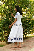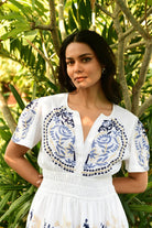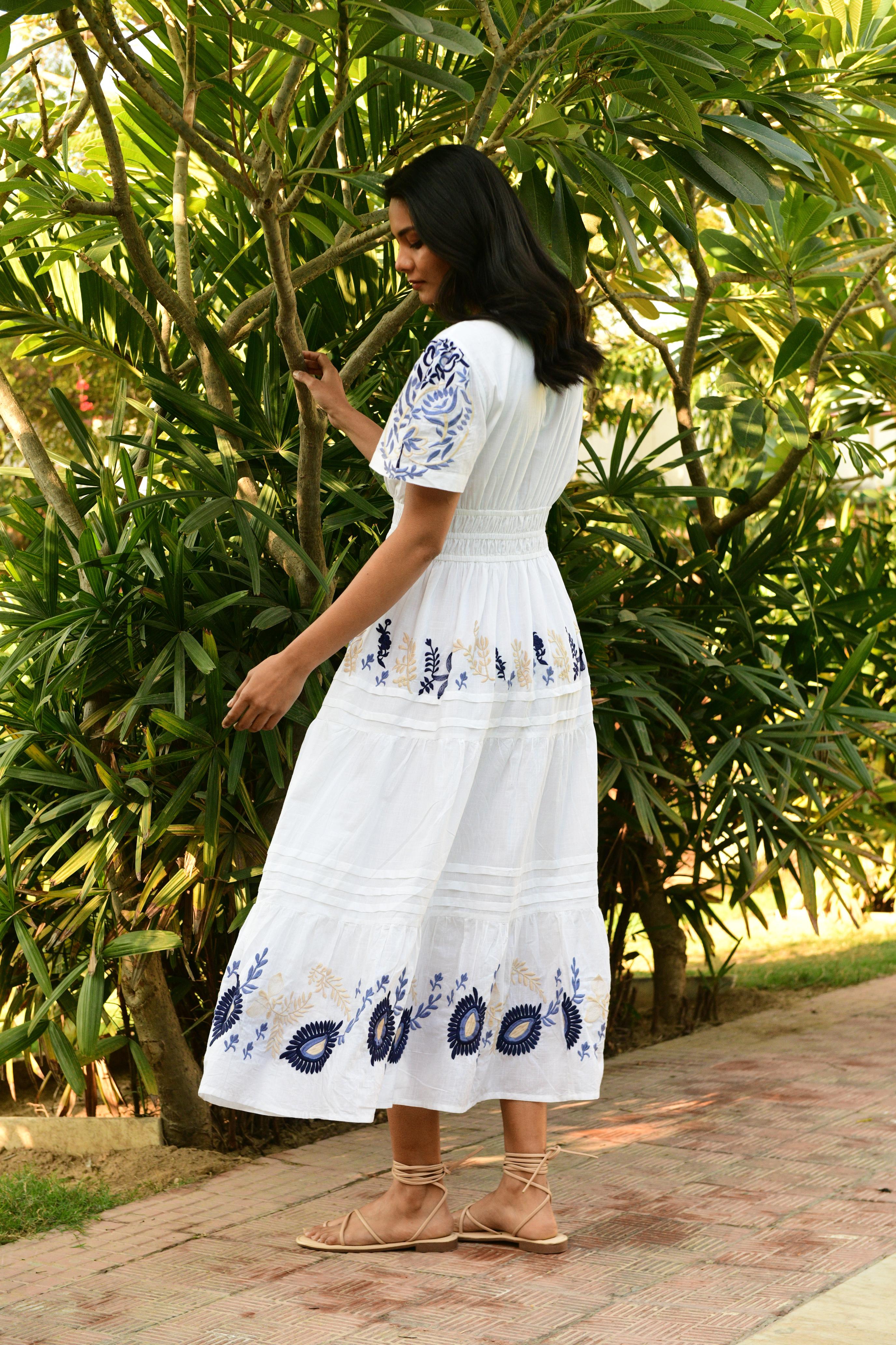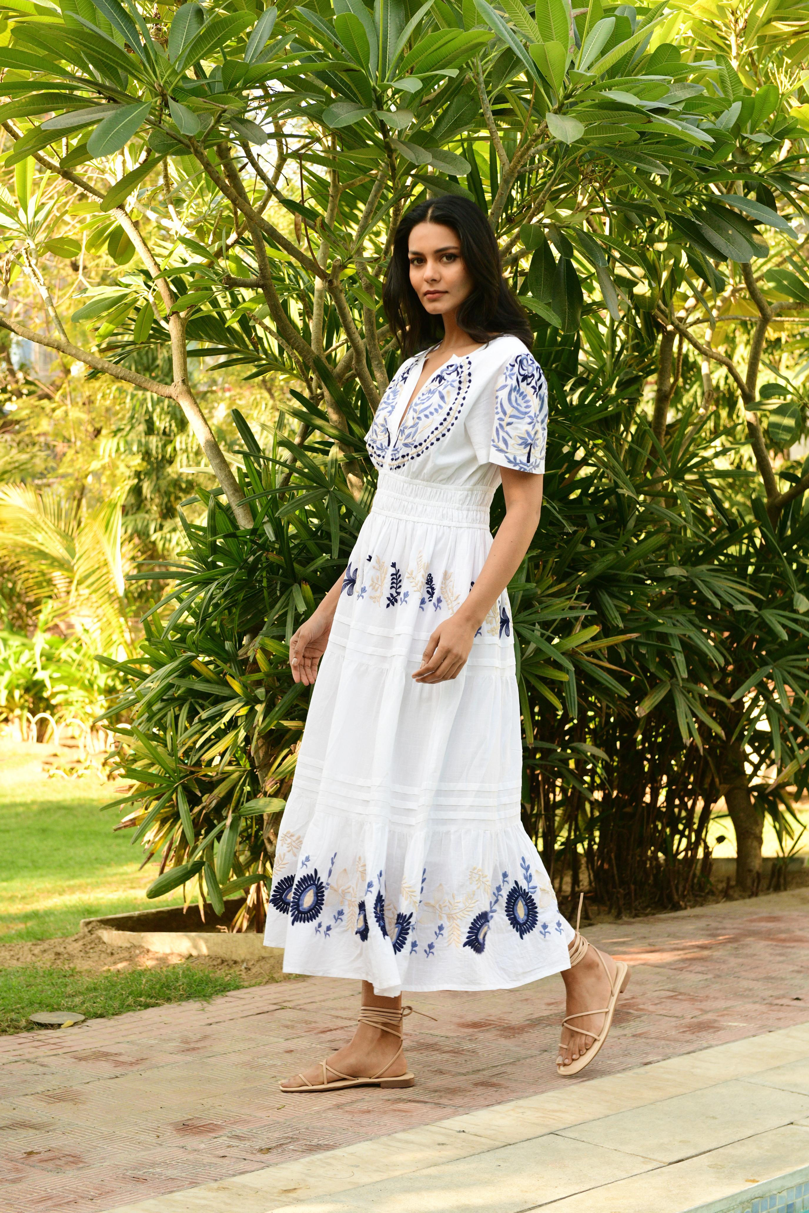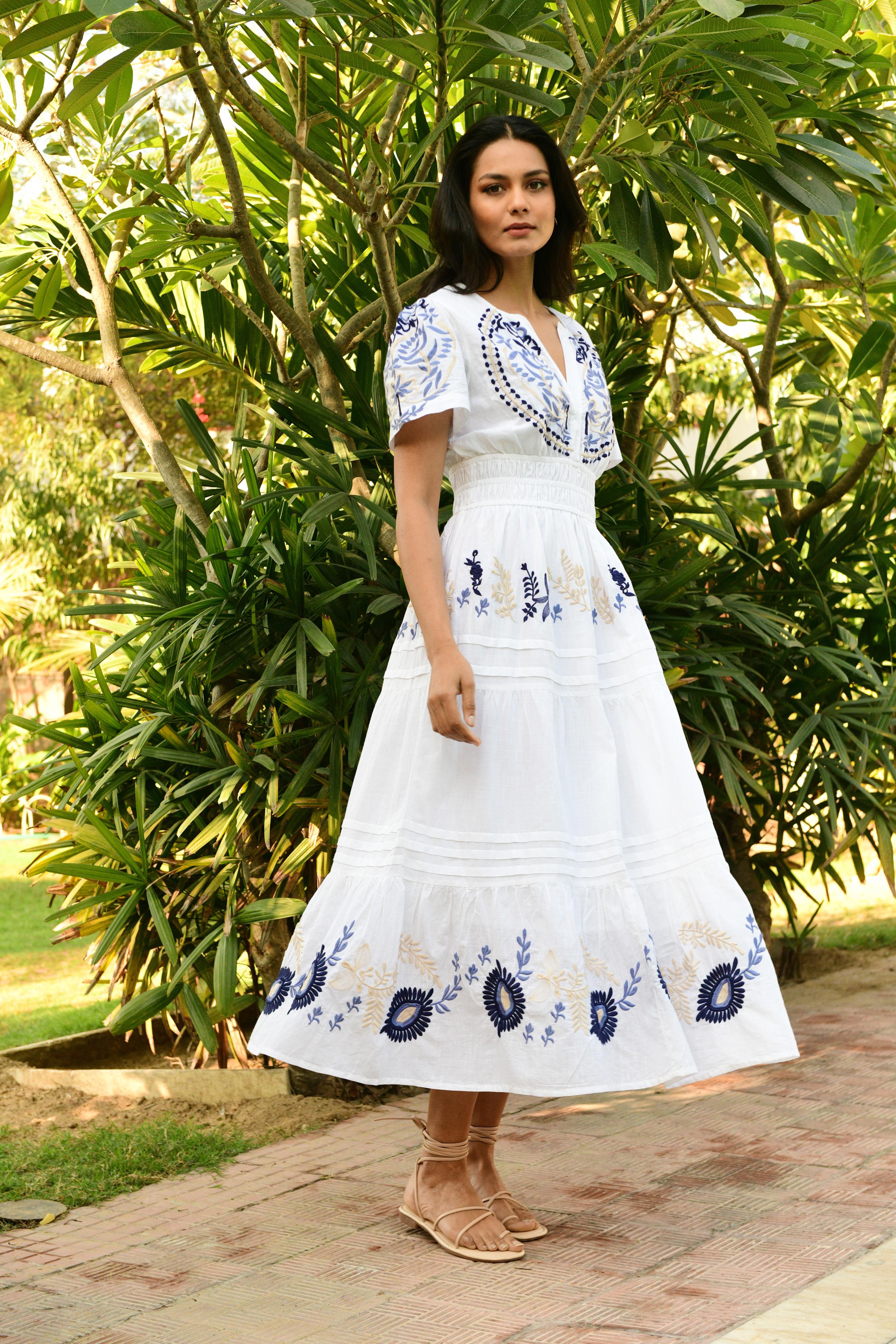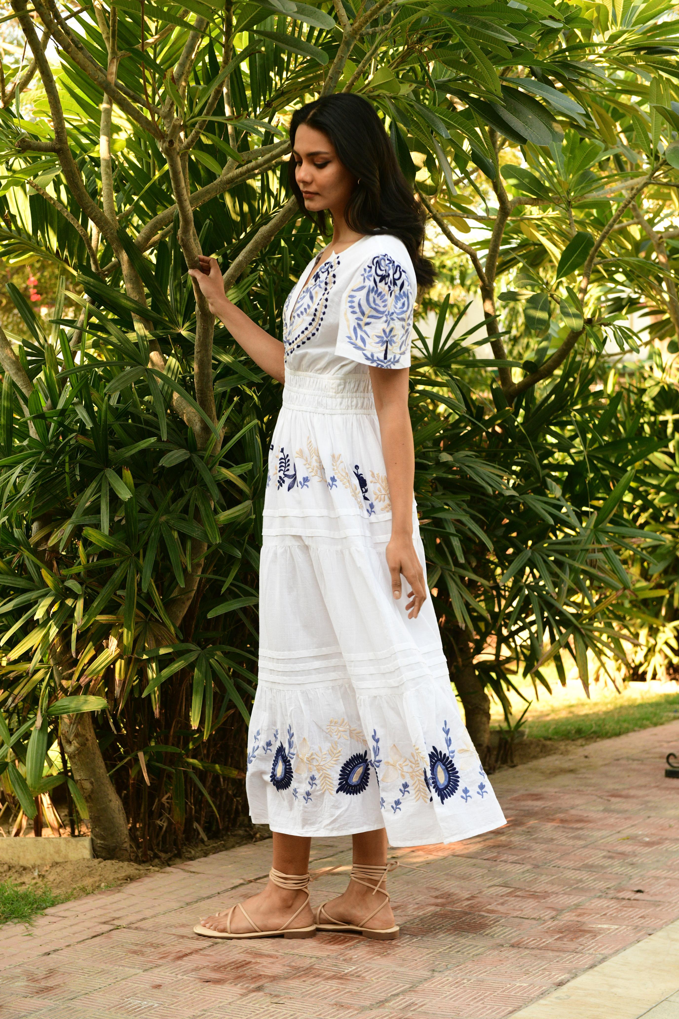 The Paradise Maxi is a standout piece in our Australian resort wear collection, crafted in soft white cotton with tonal blue and nude embroidery. The cap sleeves and beautifully cinched double-elastic waist create a flattering, shaped silhouette, while the A-line skirt falls gracefully to the ankle. Embroidery is thoughtfully placed across the bodice and along the tiered hem, adding artisanal detail that elevates the entire look.