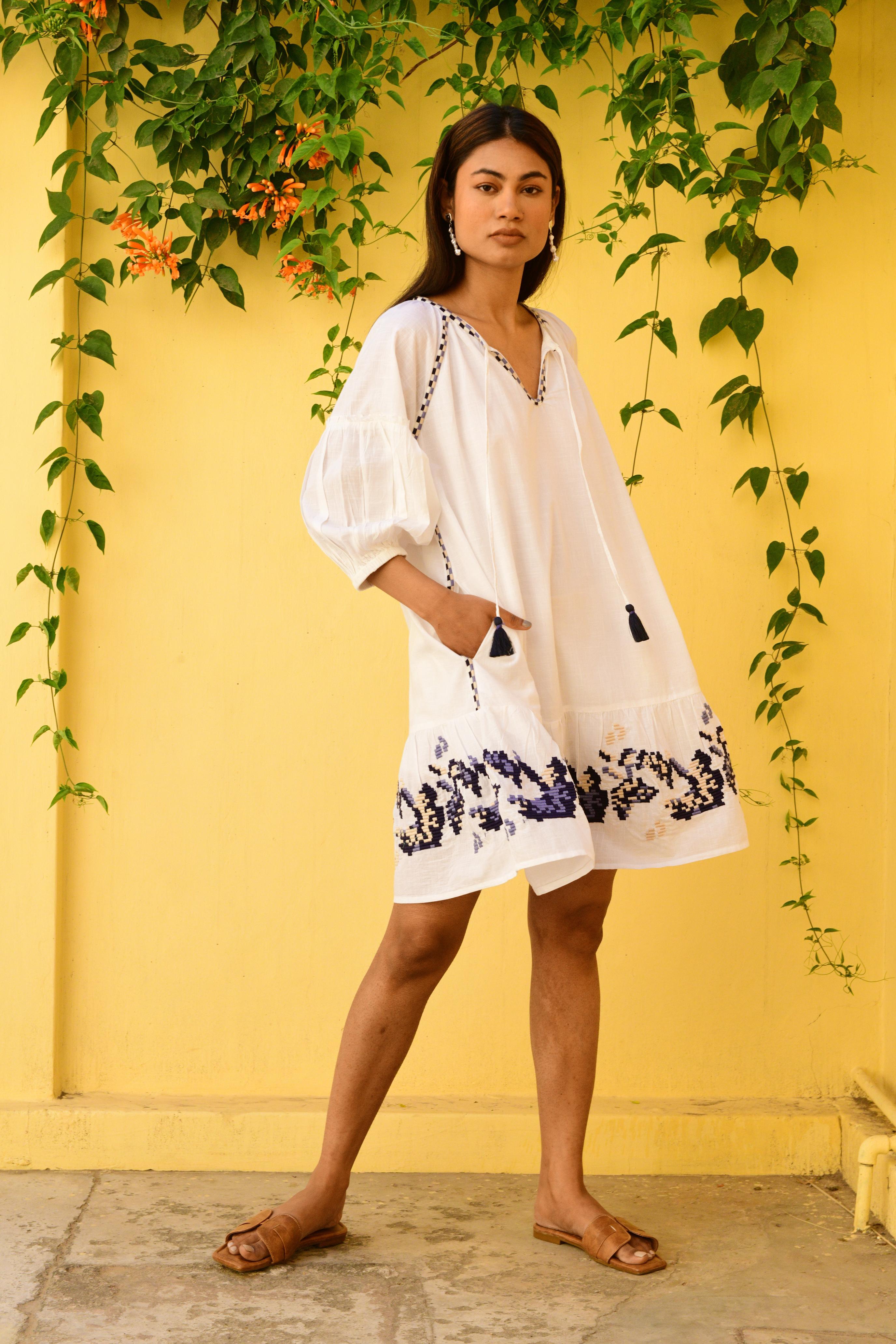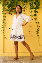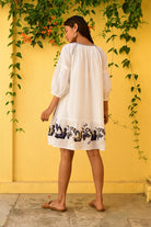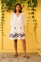 The Paradise Shift Dress is crafted from soft white cotton and finished with tonal blue and nude embroidery for a refined resort look. Designed with a clean keyhole neckline trimmed in delicate embroidery, 3/4 sleeves and a knee-length hem, this dress offers effortless ease with a touch of artisanal detail. The embroidered hem adds a soft feminine finish, making it perfect for warm days, coastal escapes and relaxed weekend dressing.
