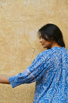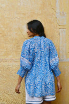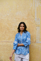 The Wisteria Shirt reimagines a classic silhouette with soft, hand block-printed florals in denim blue and natural beige. Detailed with delicate embroidered embellishment along the centre-front placket, it brings a touch of artistry to everyday dressing.