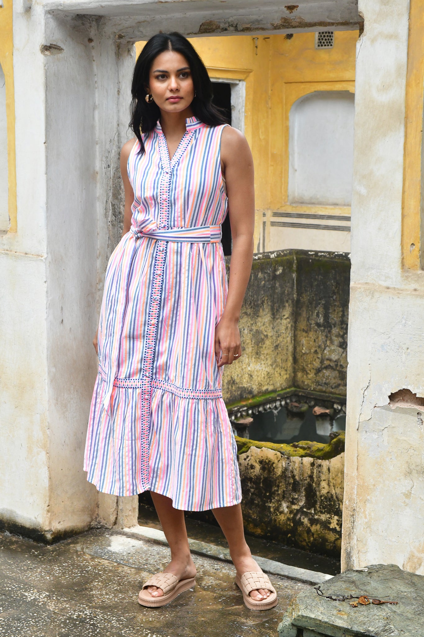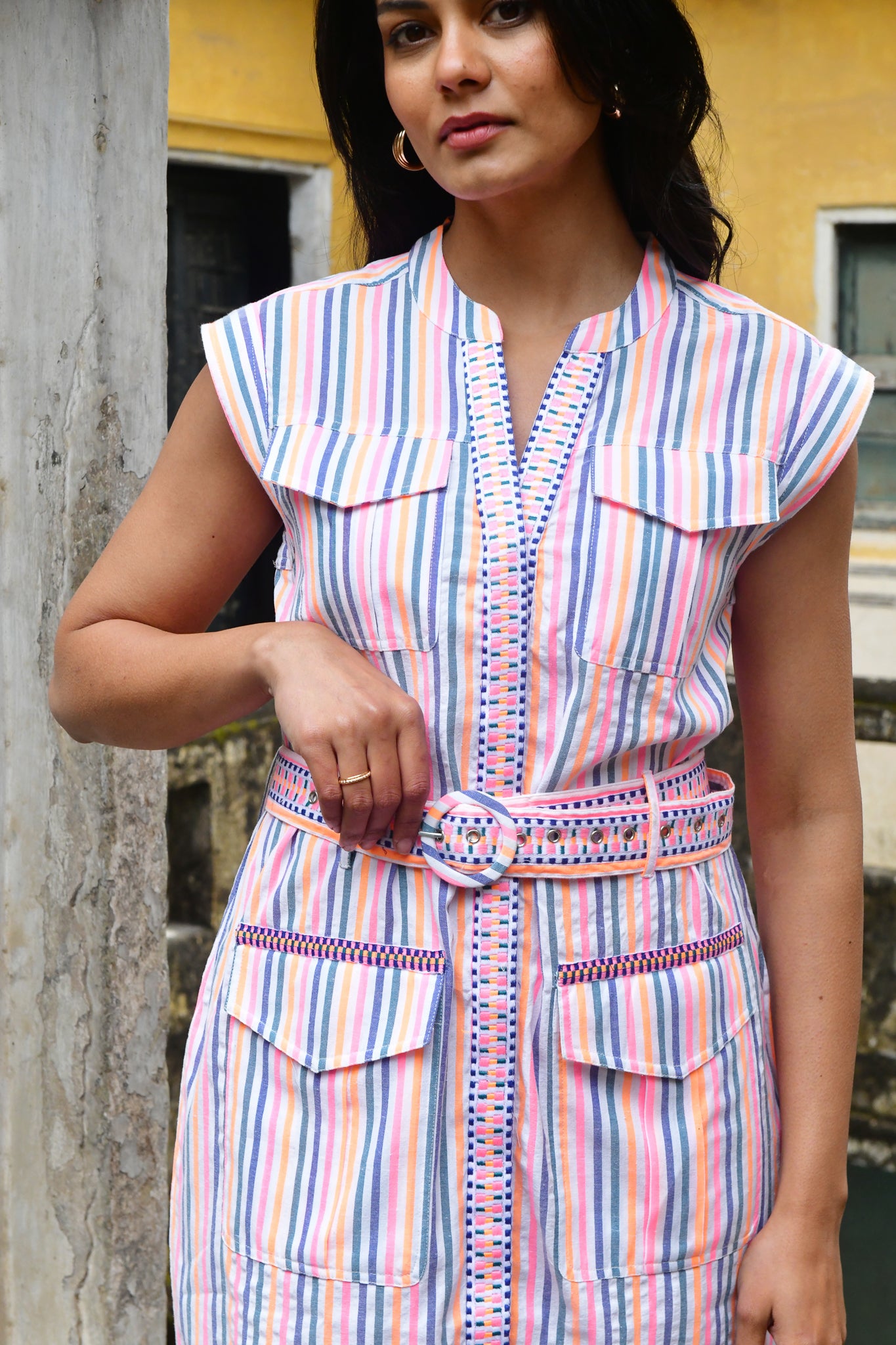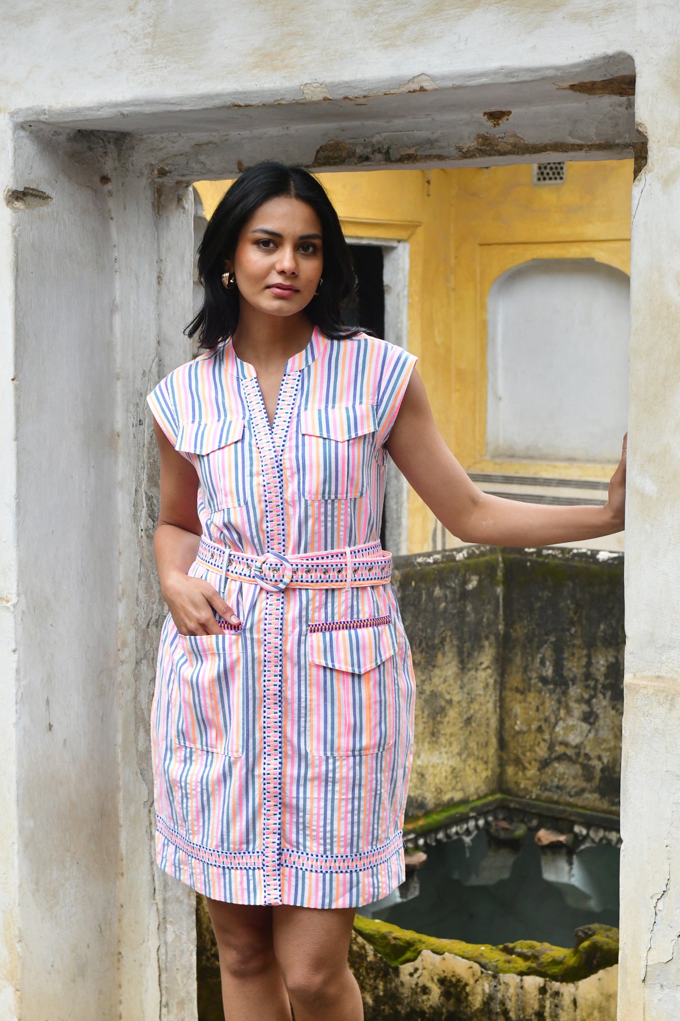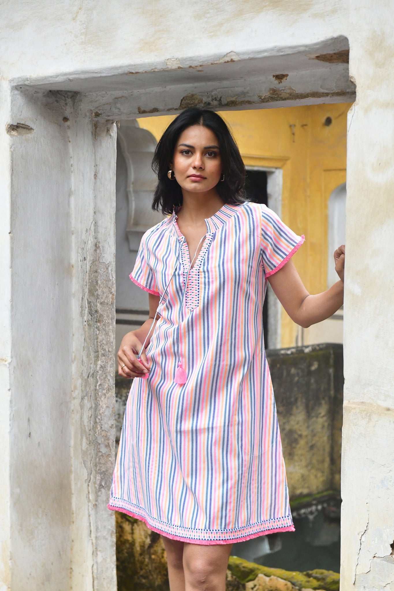 A vibrant expression of summer. Woven in beautifully textured cotton with intricate embroidered trims, this neon-bright stripe is defined by artisanal finishes and modern, feminine silhouettes — from effortless day dresses to striking maxis.