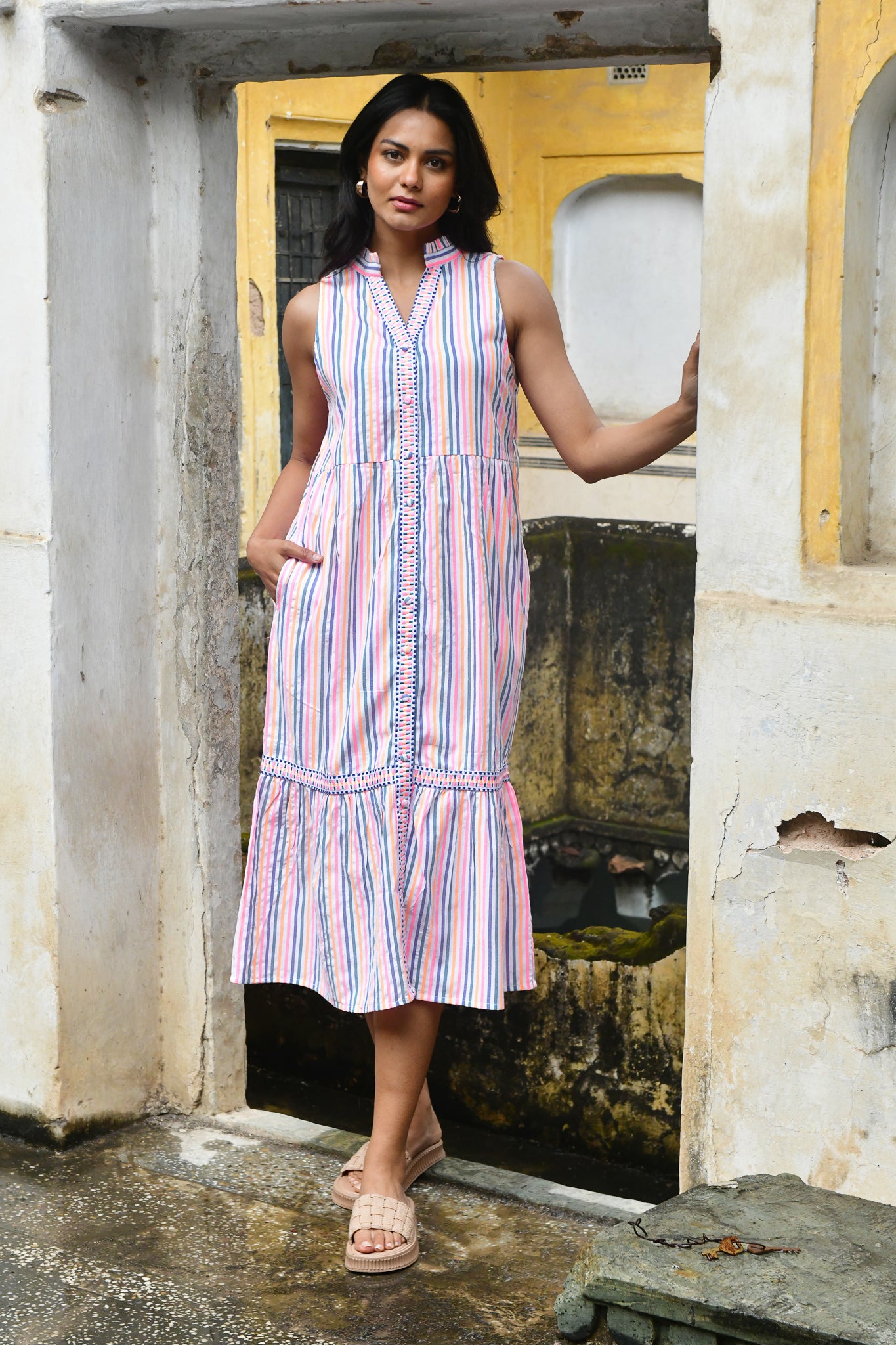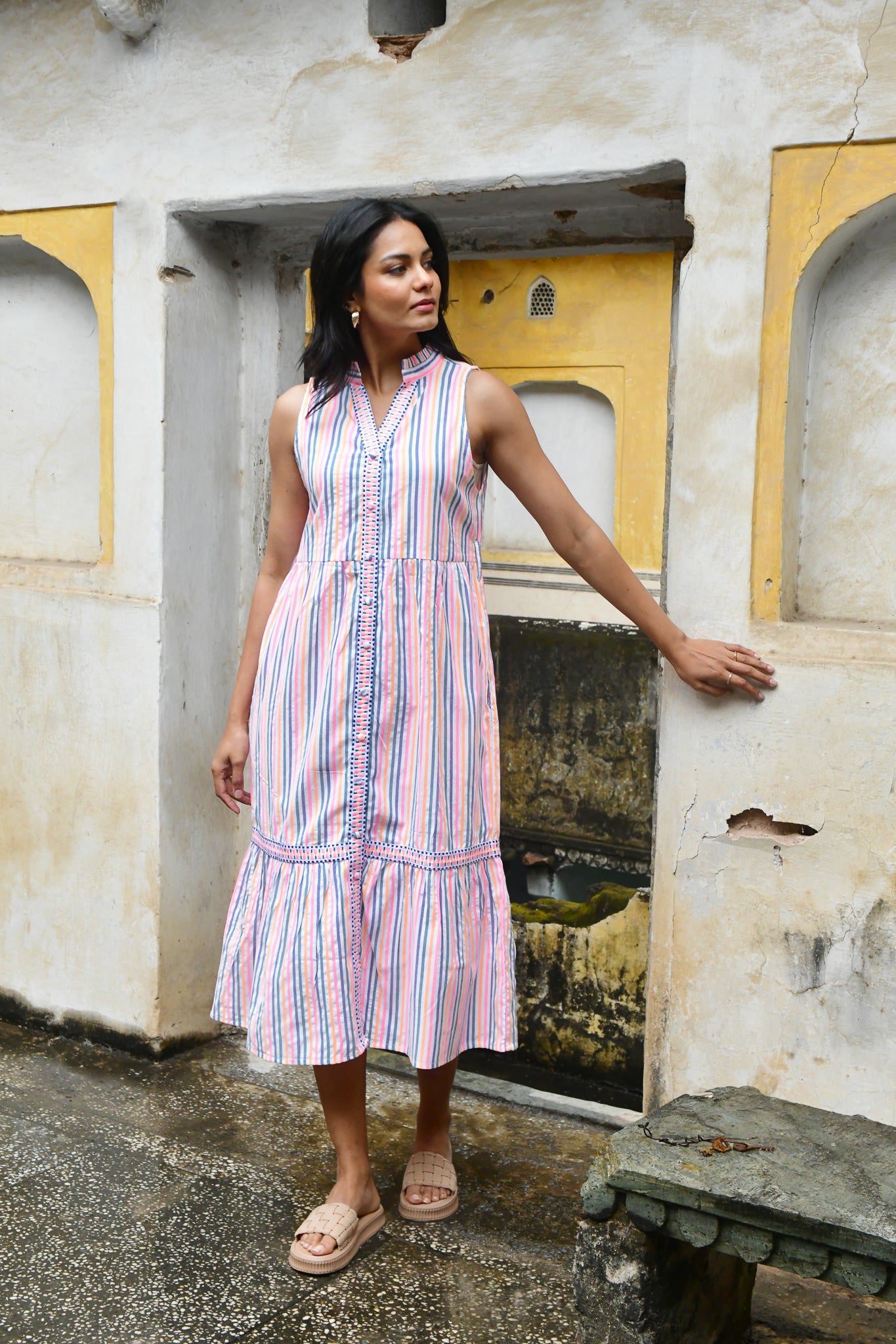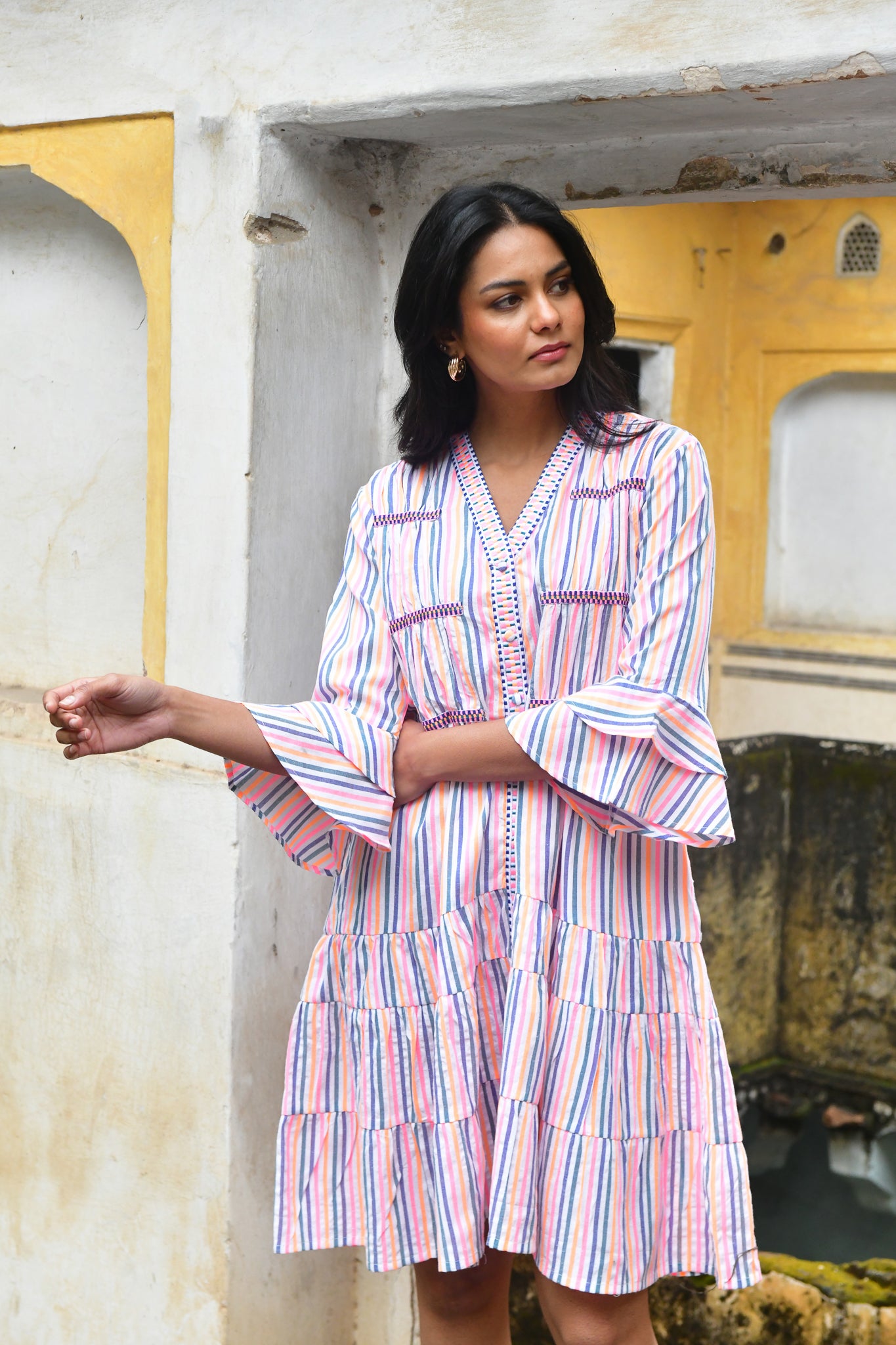 A vibrant expression of summer. Woven in beautifully textured cotton with intricate embroidered trims, this neon-bright stripe is defined by artisanal finishes and modern, feminine silhouettes — from effortless day dresses to striking maxis.