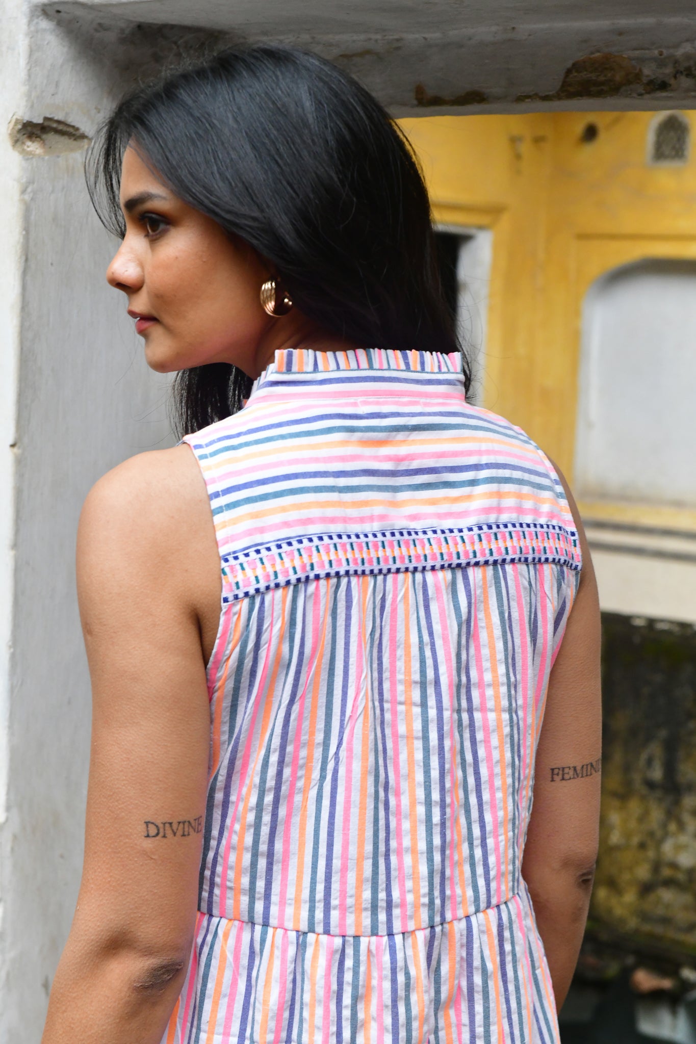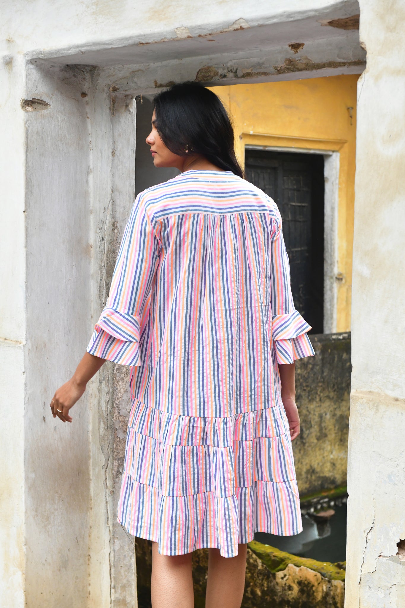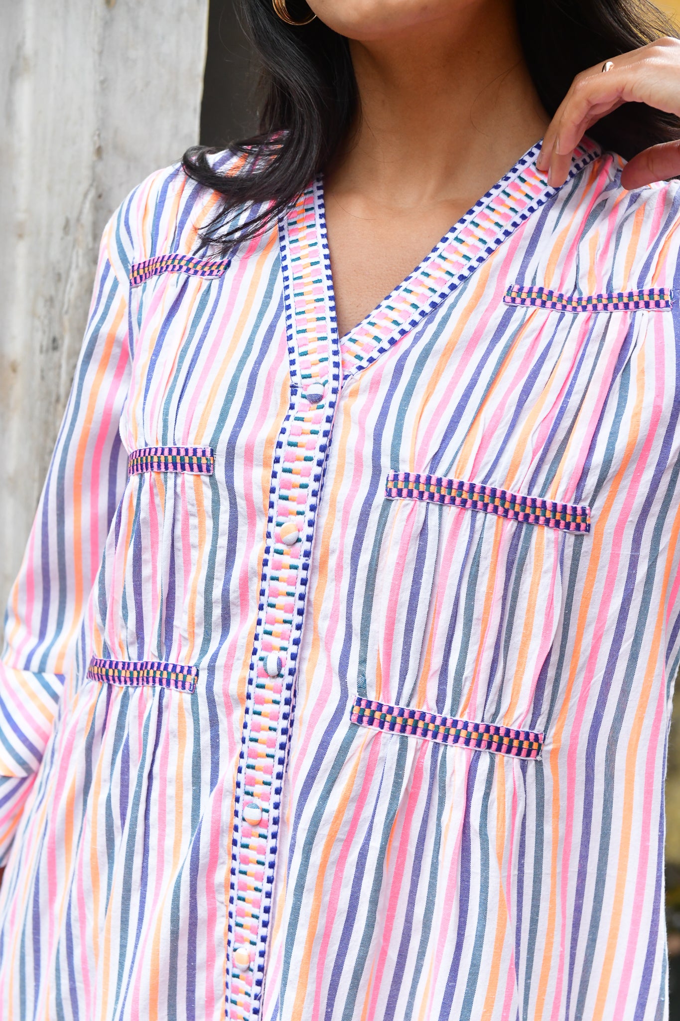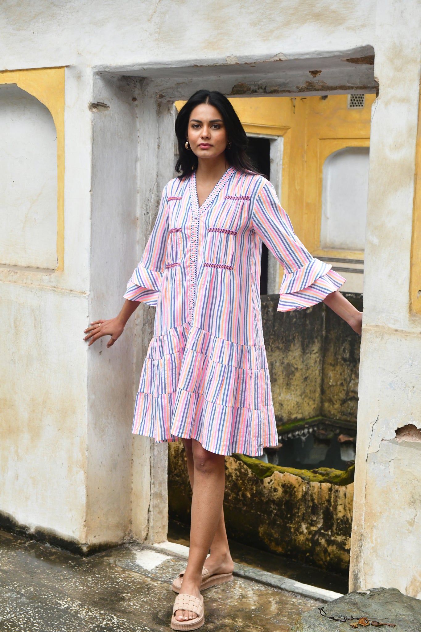 A vibrant expression of summer. Woven in beautifully textured cotton with intricate embroidered trims, this neon-bright stripe is defined by artisanal finishes and modern, feminine silhouettes — from effortless day dresses to striking maxis.