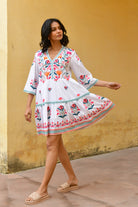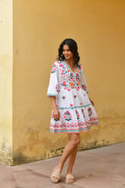 The Hummingbird Swing Dress is a standout piece in our summer collection, defined by its bespoke Hummingbird embroidery — an intricate, exclusive design that celebrates colour, craftsmanship, and effortless femininity. Cut from soft cotton, this easy silhouette features a flattering V-neckline with button front to waist, soft tier detail, and gently flared bell sleeves that create beautiful movement.