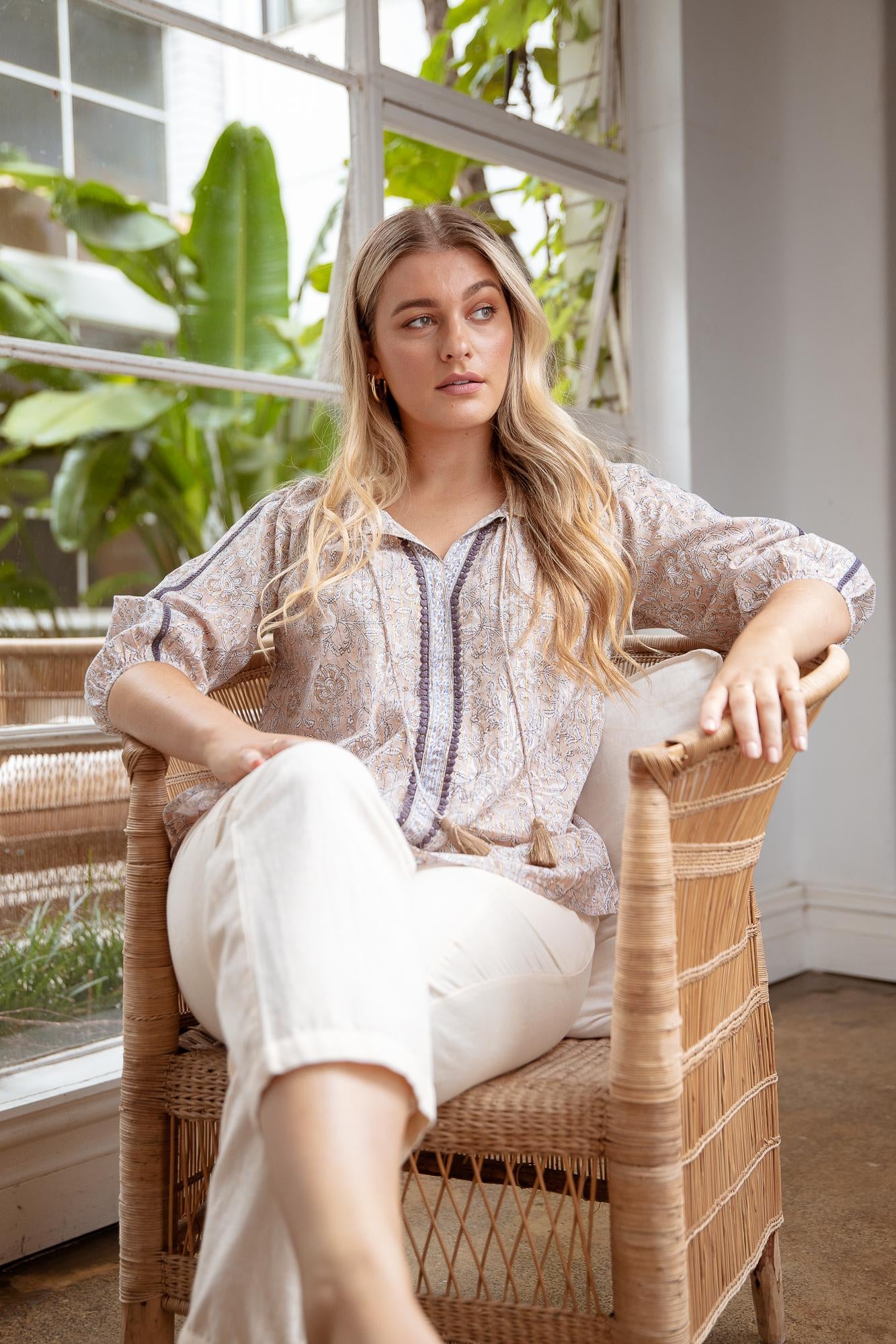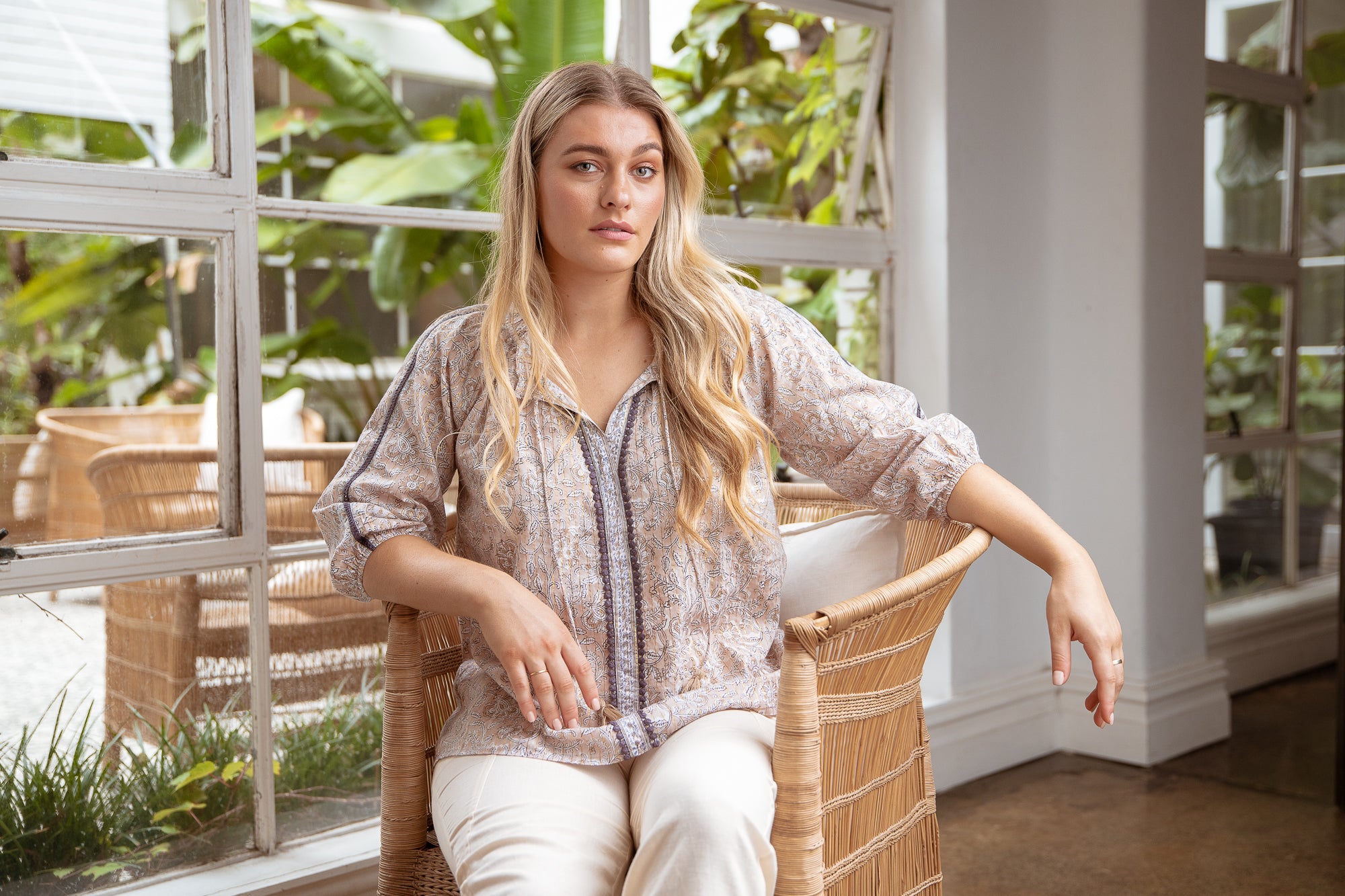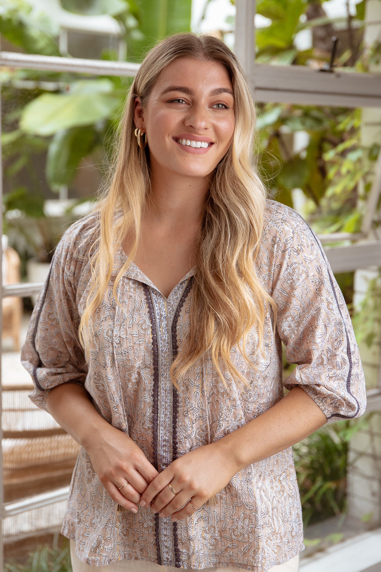 Introducing the much-loved Hayman blouse. Crafted from organic cotton woven with lurex threads, it shimmers with a subtle sparkle, perfect for adding a touch of glamour to any occasion.