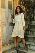 The Folk Dress features soft ¾ length sleeves in a gentle bell shape and a flattering silhouette that falls just below the knee. Intricately designed embroidery graces the bodice and flows throughout, giving this everyday style an artisanal touch.